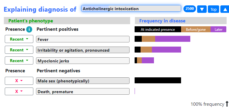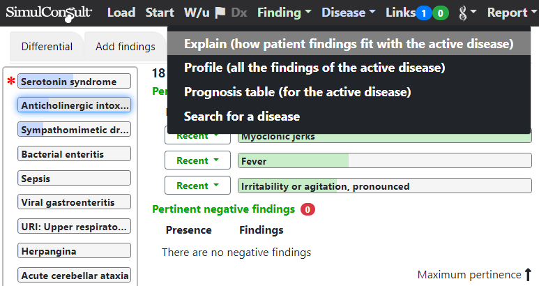 One of the deficiencies of large language models is that they are “black boxes” and can’t explain their reasoning. SimulConsult uses different approaches to diagnosis, which allow explaining why a diagnosis is ranked as it is in the differential diagnosis. To underscore the explainability of our approach, We have renamed the relevant screen Explain, and the Disease menu reflects this change in wording. The second disease in the differential diagnosis is active (Anticholinergic intoxication), so the Explain feature will comment on that: