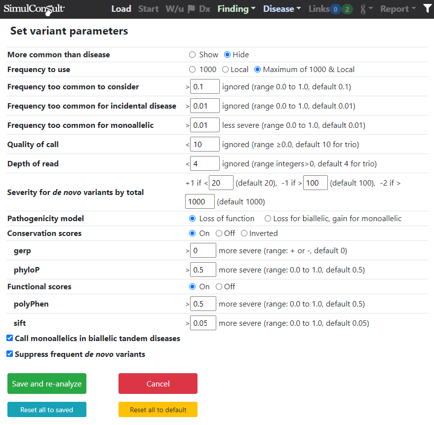 It is now possible to filter out these variants using the “Set variant parameters” screen, accessed from the Helix button on the top black navigation bar. Using the “More common that disease” option on the top line, the default “Show” is changed to “Hide” and then “Save and re-analyze” is clicked.