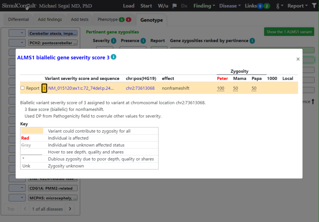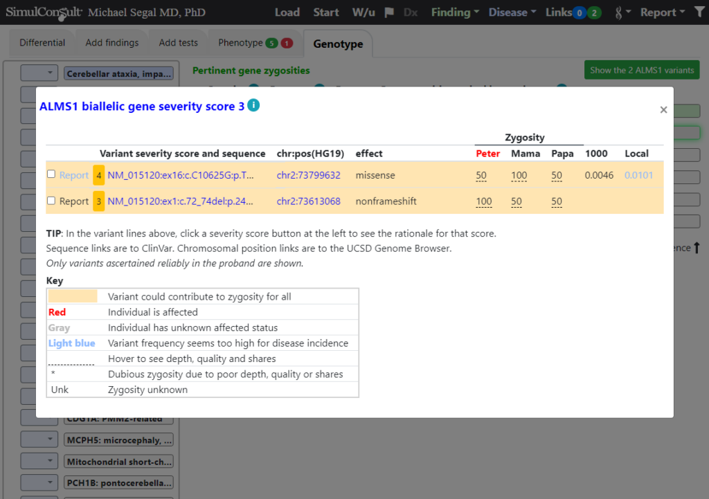 In the Genome-Phenome version of the software, variants with a frequency that seems too high given what we know about the disease incidence are shaded in light blue. This is shown below in the mini variant table for the biallelic ALMS1 gene zygosity.